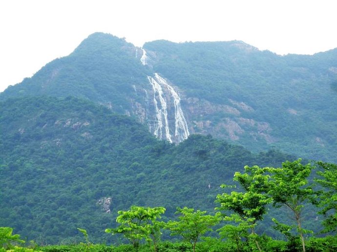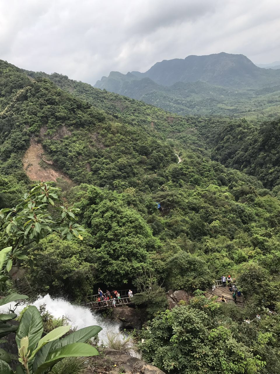 吃(chī)飽咯,大(dà)概10分鍾的車(chē)程就可(kě)以到過目的地了,突然發現眼前的天空(kōng)仿佛被一縷白布撕開(kāi),定睛遙看,原來(lái)是傾天而下的瀑布,煞是壯觀,突然想起李白的望廬山(shān)瀑布的詩句:“飛流直下三千尺,疑是銀河(hé)落九天”。