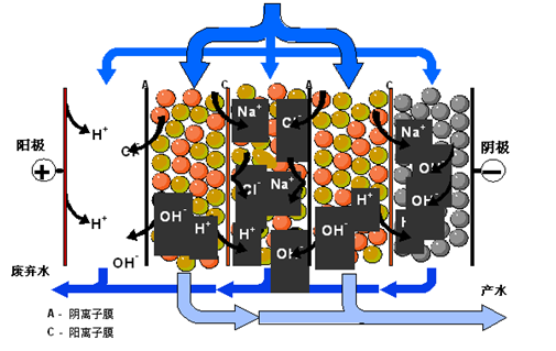 EDI裝置包括陰/陽離子交換膜、離子交換樹(shù)脂、直流電(diàn)源等設備。其中陰離子交換膜隻允許陰離子透過,不允許陽離子通(tōng)過,而陽離子交換膜隻允許陽離子透過,不允許陰離子通(tōng)過。離子交換樹(shù)脂充夾在陰陽離子交換膜之間(jiān)形成單個(gè)處理(lǐ)單元,并構成淡水(shuǐ)室。單元與單元之間(jiān)用網狀物隔開(kāi),形成濃水(shuǐ)室。在單元組兩端的直流電(diàn)源陰陽電(diàn)極形成電(diàn)場(chǎng)。來(lái)水(shuǐ)水(shuǐ)流流經淡水(shuǐ)室,水(shuǐ)中的陰陽離子在電(diàn)場(chǎng)作(zuò)用下通(tōng)過陰陽離子交換膜被清除,進入濃水(shuǐ)室。在離子交換膜之間(jiān)充填的離子交換樹(shù)脂大(dà)大(dà)地提高(gāo)了離子被清除的速度。