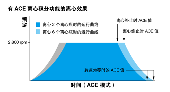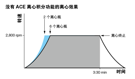 圖1. 通(tōng)常在離心的第一階段,轉頭裝2 個(gè)離心瓶時(shí)比裝6 個(gè)離心瓶時(shí)較快達到設定轉速,但(dàn)兩者均在3:30 分鍾時(shí)離心終止,所以在這兩種運行(xíng)下,離心力所作(zuò)的功是不同的。如果使用ACE 積分功能,2 個(gè)離心瓶離心的時(shí)間(jiān)将自動調整到比如3:00 分鍾以實現與6 個(gè)離心瓶離心時(shí)同樣的離心效果。隻需要在離心開(kāi)始時(shí)設定好ACE值和(hé)轉速,無論裝樣量如何變化,離心時(shí)間(jiān)将自動進行(xíng)調整以實現同樣的離心效果。