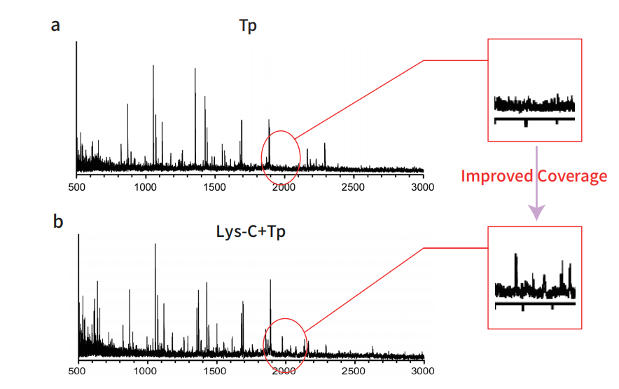 Lys-C+Tp酶切後,可(kě)以在m/z=2000時(shí)得(de)到吸收峰,而單獨的Tp酶切在m/z=2000時(shí)沒有(yǒu)吸收峰。該結果表明(míng) Lys-C 可(kě)以提高(gāo)測序覆蓋度。