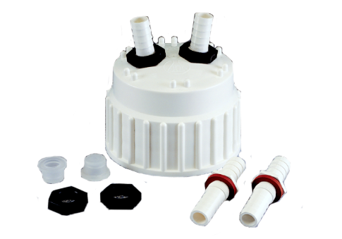 PP接口,乙縮醛螺帽,矽膠墊圈;适用于裝配在各種容器(qì)的蓋上(shàng),組成多(duō)通(tōng)蓋。很(hěn)容易安裝,隻需蓋子上(shàng)鑽兩個(gè)直徑