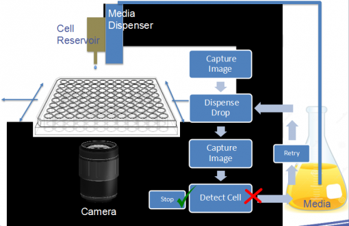 上(shàng)方的加樣器(qì)和(hé)下方的鏡頭是固定不動的,鋪闆時(shí)是中間(jiān)的闆子移動。将空(kōng)白闆子放置移動平台上(shàng),下方的鏡頭會(huì)對闆底進行(xíng)成像,然後從上(shàng)方Tank裏滴入一滴細胞懸液(體(tǐ)積是納升級别,懸液濃度計(jì)算(suàn)好,确保鋪闆濃度<0.5cell/孔),下方鏡頭會(huì)再次對闆底進行(xíng)成像,并将兩次成像的照片進行(xíng)疊加,識别是否有(yǒu)細胞滴入孔中,當識别到孔中有(yǒu)細胞滴入,旁邊的培養基分配器(qì)會(huì)對該孔進行(xíng)補液,若軟件沒有(yǒu)識别到細胞,将會(huì)進行(xíng)新的一輪加樣,重複上(shàng)述動作(zuò)。
